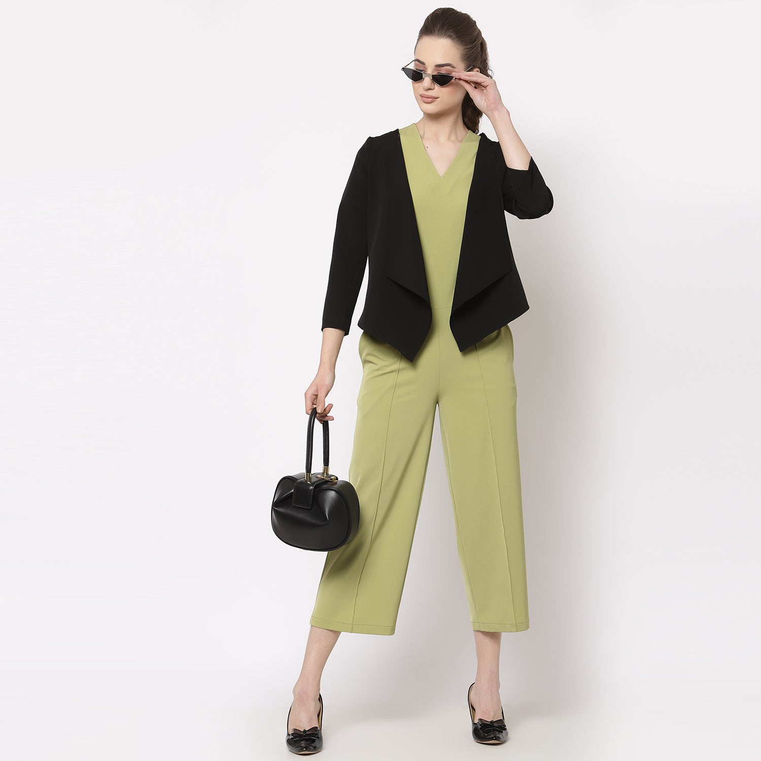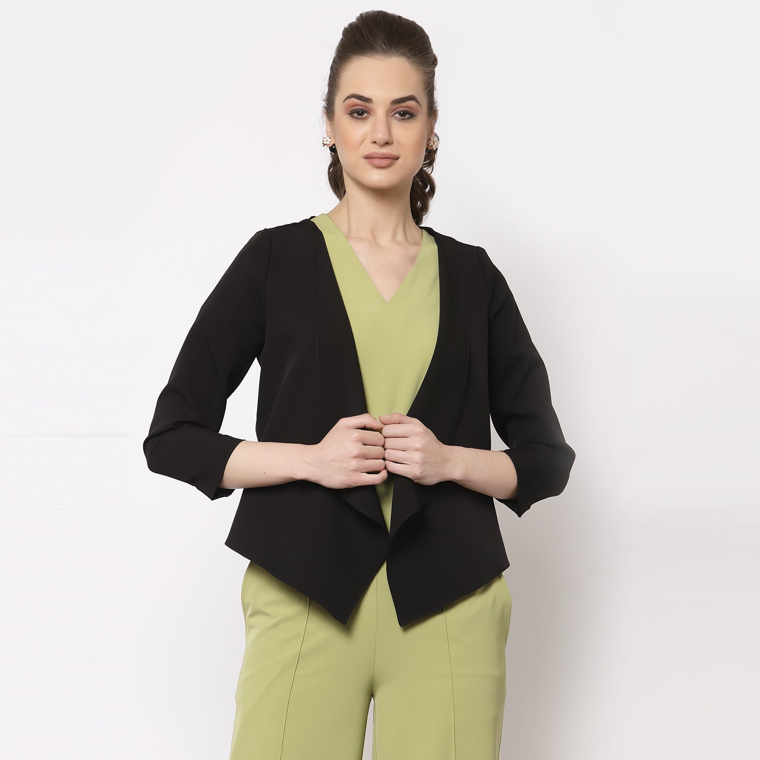 This front-open shrug is crafted in an asymmetric silhouette and features long sleeves for a refined, structured look—perfect for elevating your workwear layering.