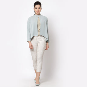 This flared-hem jacket features a buttoned collar detail and long sleeves, crafted in a chic A-line silhouette for a polished look.