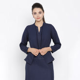 This gorgeous navy blue jacket by Office and You is perfect for your board meetings. Featuring a lovely rose broach on the left shoulder, the full-sleeve jacket looks amazing in its fringe design, which is perfect for any blue formal attire.